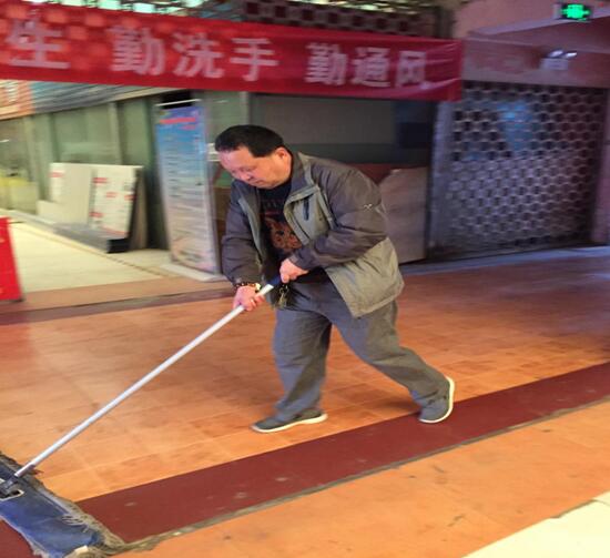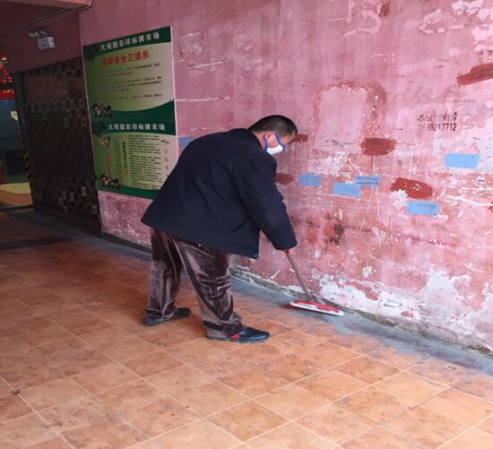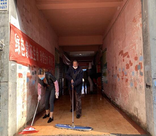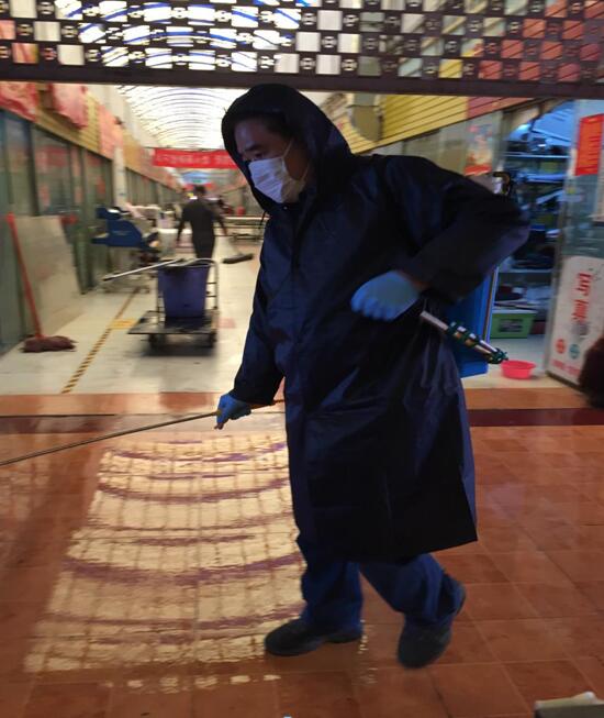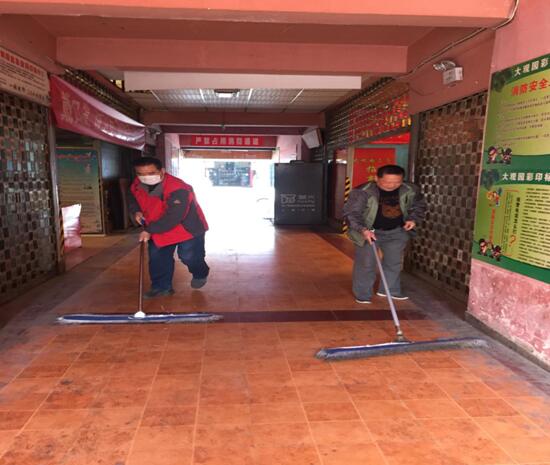 行動中,每個人都各司其職,有條不絮的進行著,有的拿著掃帚、簸箕、拖把、水盆等,對市場的通道和墻面、地面、及擺放的物品進行整理和清潔。