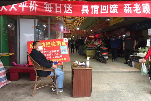市場入口設(shè)立的體溫監(jiān)測點仍然有專人測量體溫,出示市民一碼通或掃碼登記、必須佩戴口罩方可進入市場,避免人員聚集扎堆。只有做到防控不松懈,才能保障市場商戶和顧客的安全健康。