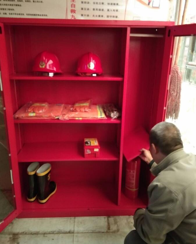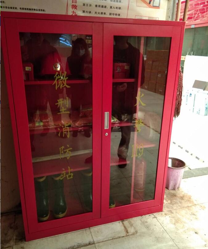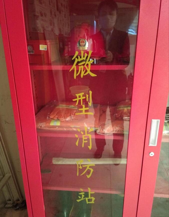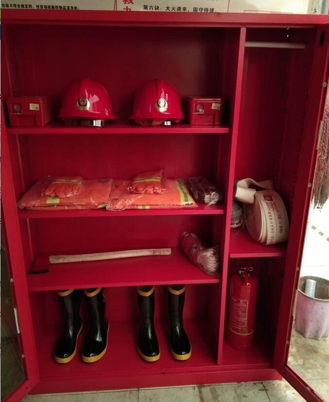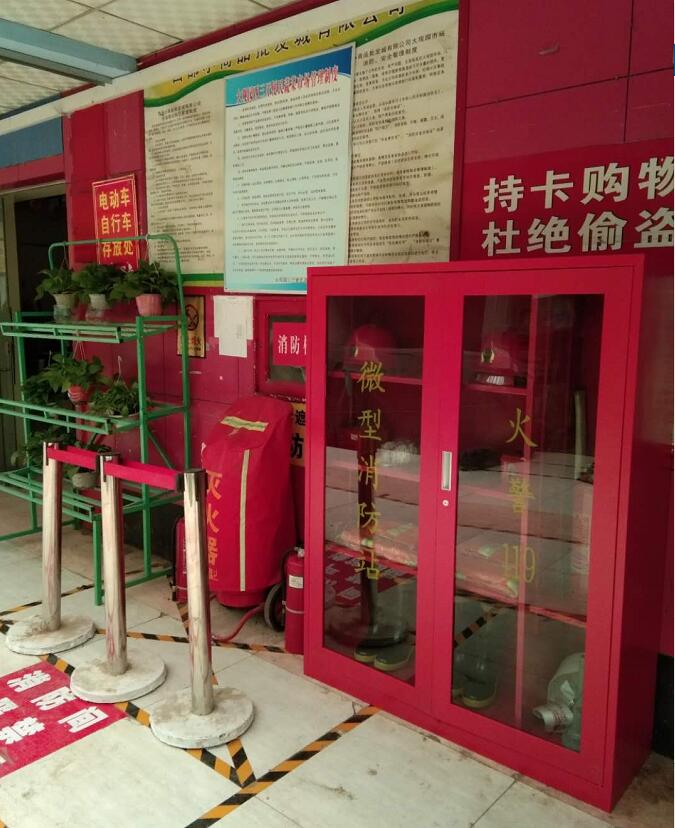 今天又新添置了兩組微型消防站,分別擺放在東西大廳。每處配備了安全帽兩頂、防毒面罩兩個(gè)、消防服兩套、板斧一把、滅火器一個(gè)、膠鞋兩雙、水槍水袋一副、繩索一條,品種齊全!