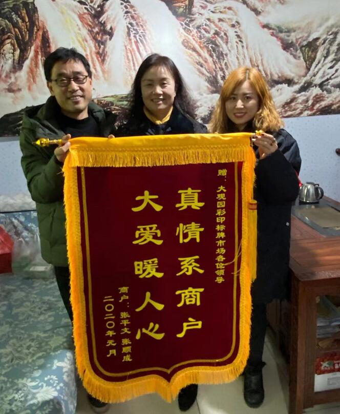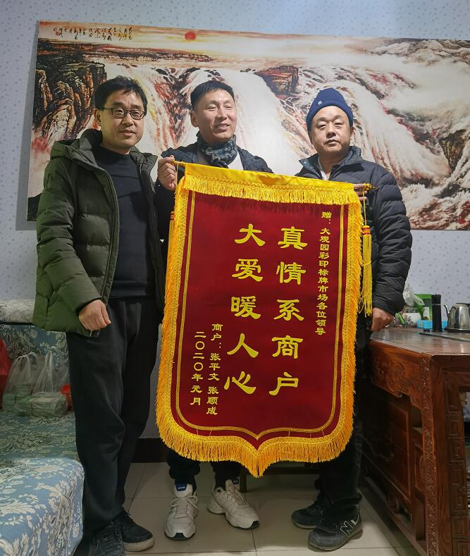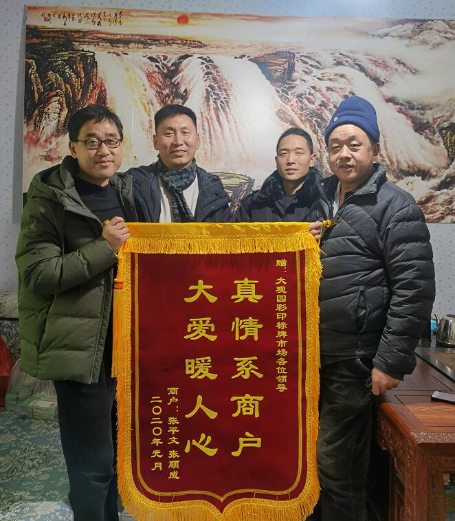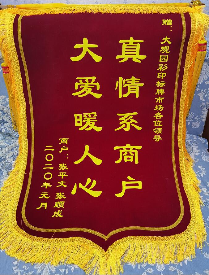 一面錦旗就是一面鏡子,它無(wú)時(shí)無(wú)刻不在激勵(lì)鞭策著市場(chǎng)辦的工作人員,“以商戶(hù)為本、為商戶(hù)解困”是市場(chǎng)辦工作的宗旨和原則,錦旗雖輕,情意濃濃,既蘊(yùn)藏著商戶(hù)們對(duì)大觀(guān)園市場(chǎng)的感激與信任,更是對(duì)樂(lè)于奉獻(xiàn)品德的肯定。