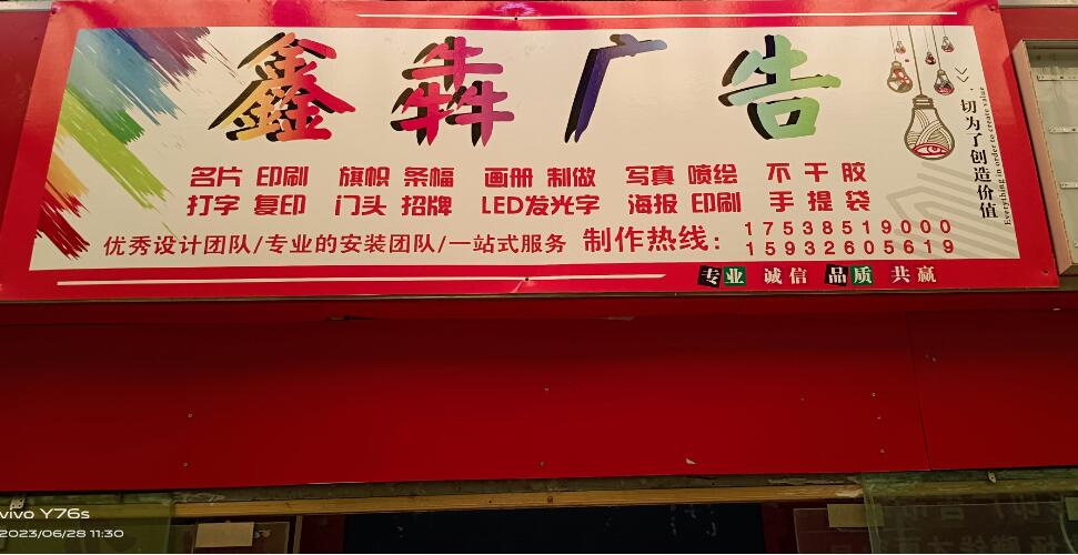 鑫犇廣告主營名片印刷,旗幟條幅,門頭招牌、LED發(fā)光字,寫真噴繪,海報手提袋等設(shè)計(jì)、制作、安裝一站式服務(wù)。