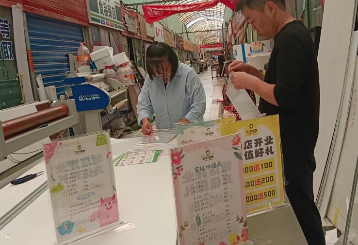 往市場(chǎng)通路中走一下,中排59#的晟龍廣告老板還在辛勤地安裝,粘貼宣傳展板,估計(jì)也是賺個(gè)盆滿缽滿,賺錢的感覺真爽??!