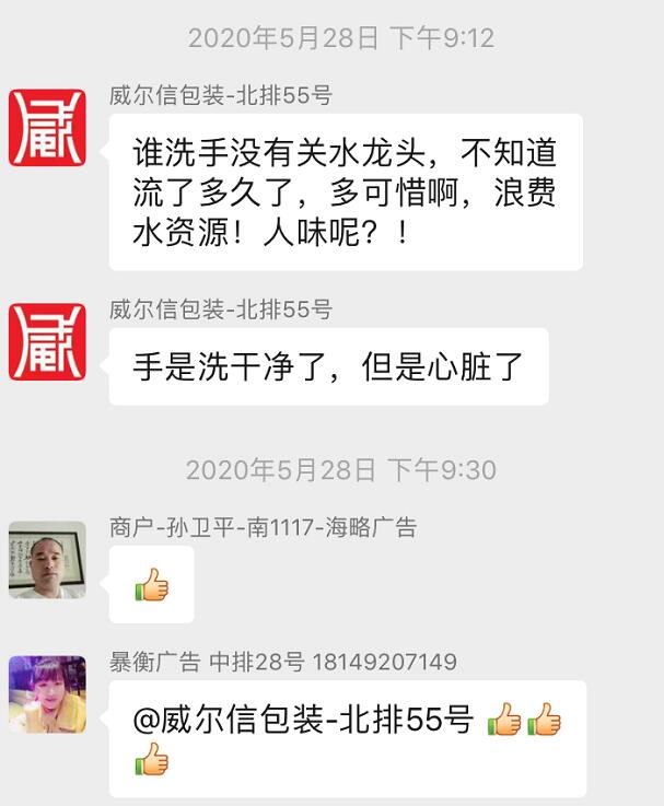 近期我們(西安大觀園彩印標牌市場)市場辦經(jīng)常接到市場商戶反應的市場內(nèi)公共洗手間洗手盆上的水龍頭經(jīng)常有人洗完手不關(guān)水龍頭事件頻頻發(fā)生。當時市場為了節(jié)約用水,杜絕浪費安裝了刷卡水表,在使用過程中商戶因為不方便向市場提出了很多意見,經(jīng)過市場辦協(xié)商,也為了讓商戶更加方便市場物業(yè)師傅加班加點,不辭辛苦為大家安裝了新的面盆、水龍頭,,但是有些人特別不自覺,洗完手水龍頭不關(guān)人就走了,幸好有我們市場北排:55號的張老板(張秉賢)威爾信包裝、中排:028(暴恒)暴衡廣告這兩位商戶,首先市場辦向您兩位說聲謝謝!您們用您們高貴的手關(guān)閉了一直流著水的水龍頭,在此,市場辦在次向您兩位表示深深的感謝!我們都要向您兩位學習并向大家發(fā)出倡議: