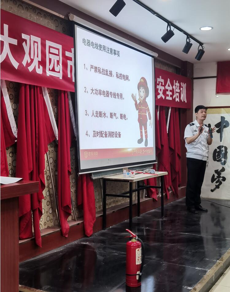 消防安全作為生產(chǎn)安全的重中之重,大觀園彩印市場始終將消防安全培訓(xùn)、演練作為每位商戶必須掌握的技能之一,每年都投入大量人力、物力、財力進(jìn)行全員培訓(xùn),并且進(jìn)行實(shí)戰(zhàn)消防演練,其目的就是為了杜絕火災(zāi)的安全隱患。
