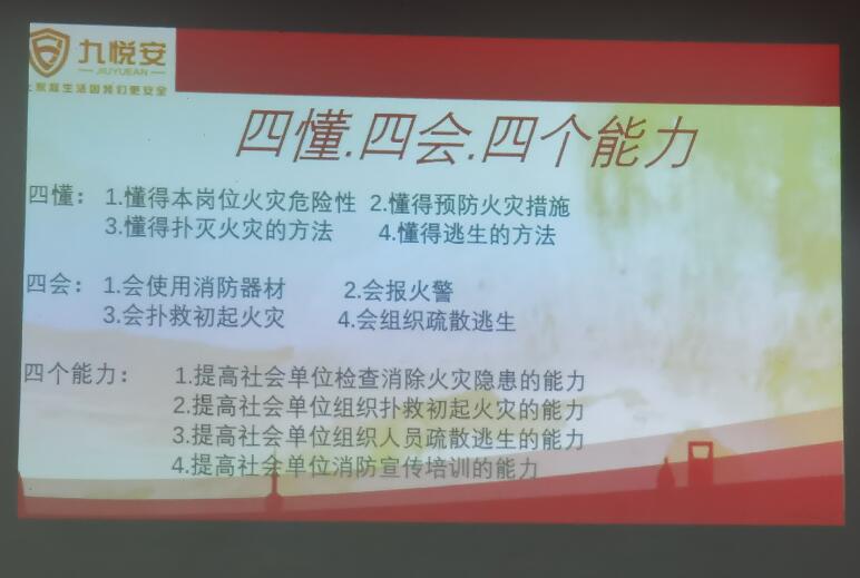 此次培訓(xùn)的主要內(nèi)容有:容易引發(fā)火災(zāi)的消防安全隱患;火災(zāi)的分類(lèi);高樓發(fā)生火災(zāi)自救;家庭電器設(shè)施、設(shè)備正確使用;燃?xì)饧半娖魇褂玫陌踩?;火情緊急情況處置;鑒別滅火器是否有效和正確的使用及防煙面具、滅火毯的使用方法;火災(zāi)應(yīng)急疏散常識(shí);家庭必備滅火器材等。