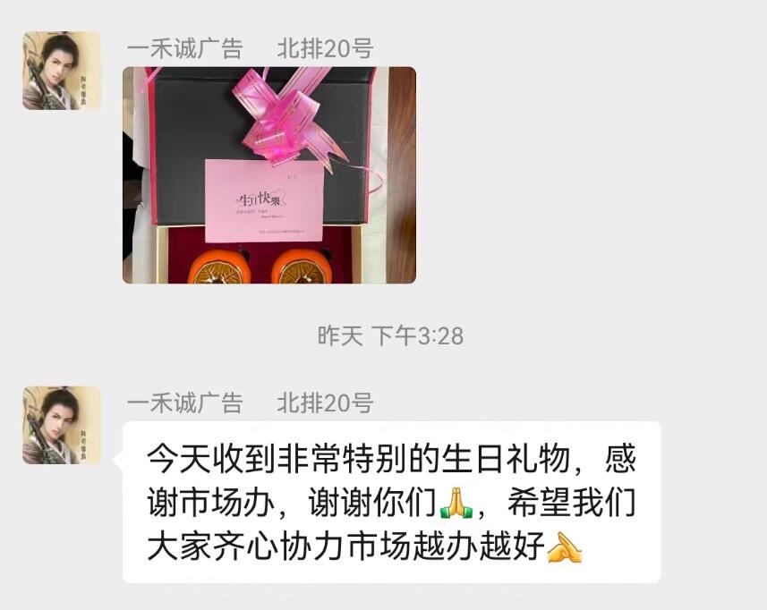 這是大觀園彩印廣告市場北排20號的一禾誠廣告,程老板在過生日的時刻,有感而發(fā),因為大觀園彩印廣告市場近幾年來一直誠摯地對待市場全體商戶們,生日時送上真誠的祝福和驚奇的小禮物,商戶如有家庭困難里市場辦帶頭倡導(dǎo)幫扶物質(zhì)上的幫助,重大節(jié)日時市場辦工作人員給家家戶戶送來節(jié)日的祝福及節(jié)日的禮品,市場永遠(yuǎn)是一片和諧。