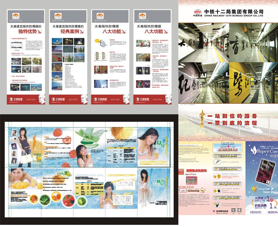 宣傳畫冊、宣傳彩頁、高檔菜譜、門票請柬、掛旗海報、不干膠貼、信封信紙、復(fù)寫聯(lián)單、包裝盒、手提袋、餐巾紙盒、招貼海報、掛歷臺歷、彩色臺卡、PVC卡、年畫等.